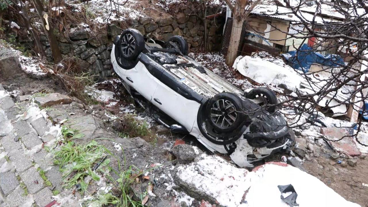 Üsküdar'da kar yağışının etkisiyle yokuş aşağı kayan otomobil bahçeye uçtu: 3 yaralı