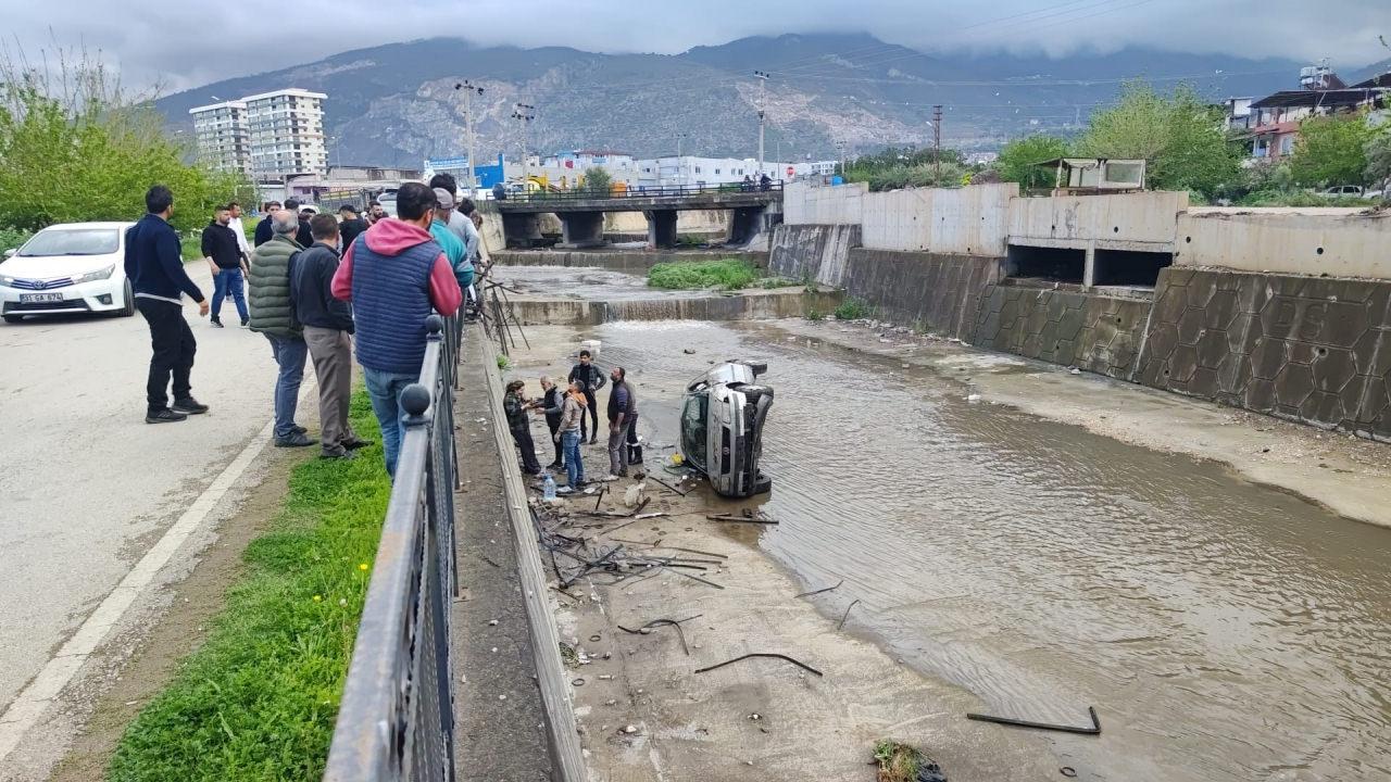 İskenderun ilçesi Muradiye Mahallesi Sanayi Sitesi yakınlarında sürücüsünün kontrolünü yitirdiği otomobil, demir korkulukları yıkıp feyezan kanalına uçtu.