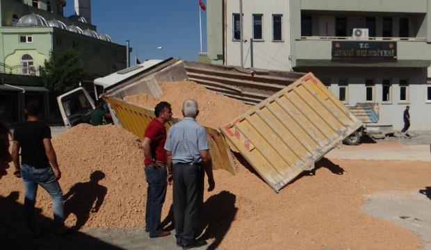 Atatürk Caddesi yapımı devam eden yola çakıl taşıyan hafriyat kamyonu yolun aniden çökmesi sonucu devrildi.