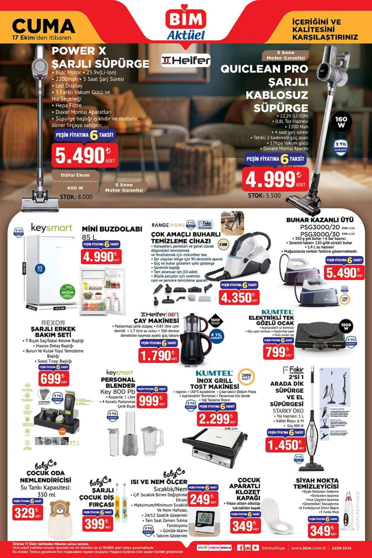 BİM 17 Ekim 2025 tarihli ürünler arasında 65 İNÇ 4K HDR GOOGLE TV 16.990 TL,(Peşin fiyatına 4 taksit), Manyetik araç telefon tutucu 249 TL, POWER X Şarjlı Süpürge 5.490 TL (Peşin fiyatına 6 taksit) gibi ürünler yer alıyor.