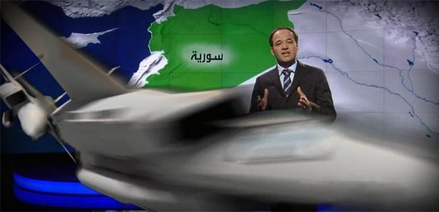 Uçaklar Ortadoğu haritası üzerinden uçarak Suriye'yi bombaladı, etrafa sıçrayan toz duman sunucunun ceketinin üzerine düşüyor görüntüsü oluştu. Muhabir ceketini eliyle temizleyerek başka bir konuya geçti.