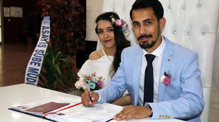 Aydın'da Hırsızlık Bürosunda komiser olarak görev yapan Emre Özçelik'in mesai arkadaşları, nikah töreninde damat Özçelik ile gelin Sırma Kamak'ın bileklerini kelepçeyle birleştirdi.