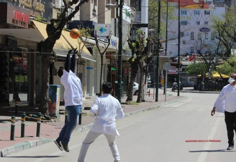 Bursa'da sokağa çıkma kısıtlamasında dükkanlarını açan eczacılar, müşteri olmadığı için canları sıkılınca, şehrin en kalabalık caddesine ip gerip voleybol oynadı.