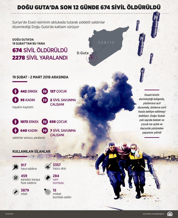 Esed rejimi ve destekçilerinin Doğu Guta'ya son 12 günde düzenlediği saldırılarda 674 sivil hayatını kaybetti.