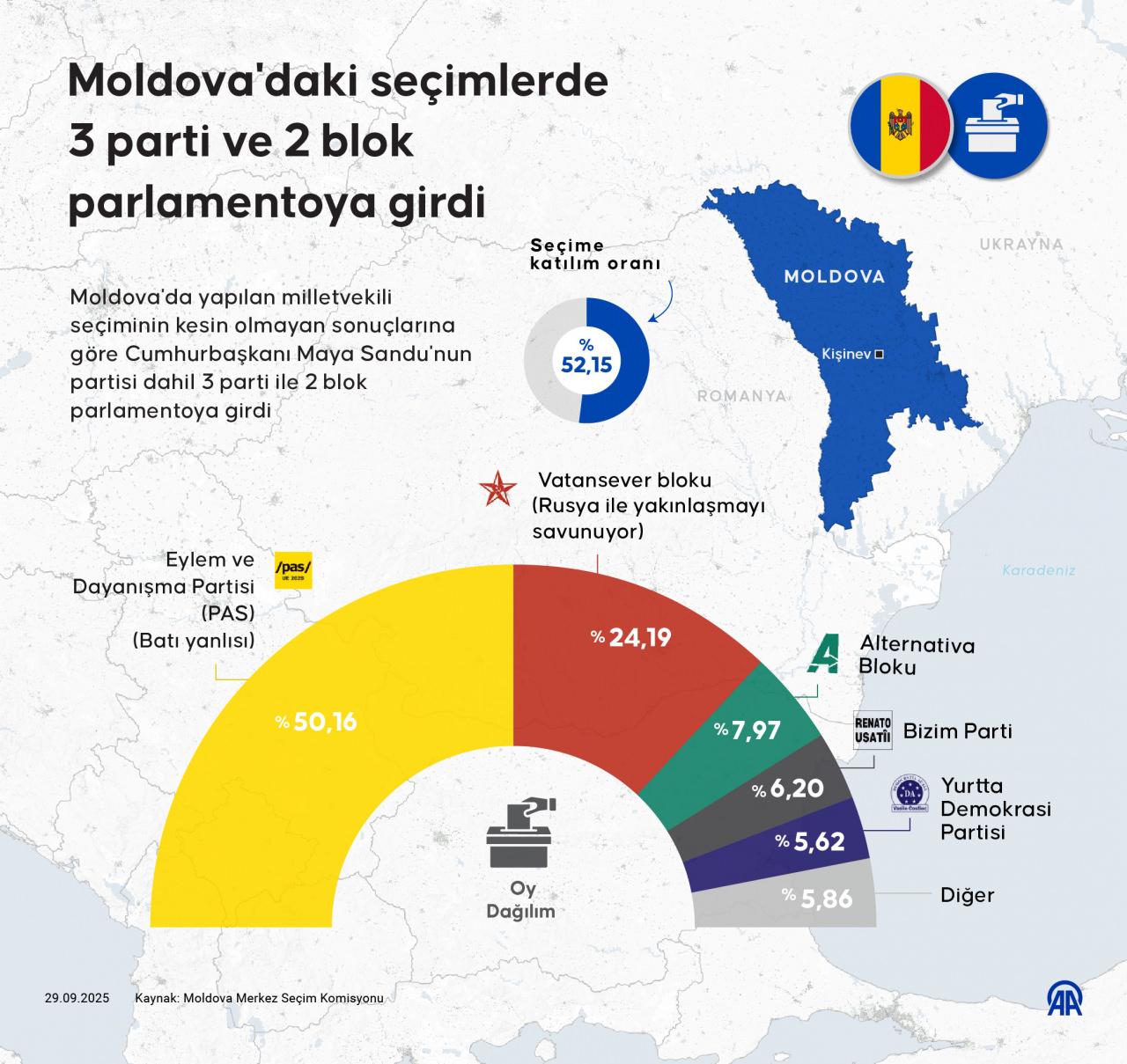 Son dakika haberi: Moldova’da Pazar günü gerçekleştirilen ve ülkenin AB-Rusya eksenindeki jeopolitik yönü açısından kilit öneme sahip seçimleri AB yanlısı iktidar partisi PAS kazandı.
