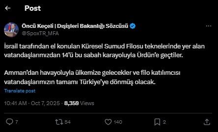 İsrail'in saldırdığı Küresel Sumud Filosu'nda yasa dışı şekilde alıkoyduğu Türk vatandaşlarının son durumuna dair açıklamada bulunan Dışişleri Bakanlığı Sözcüsü Keçeli "İsrail tarafından el konulan Küresel Sumud Filosu teknelerinde yer alan vatandaşlarımızdan 14’ü bu sabah karayoluyla Ürdün’e geçtiler. Amman’dan havayoluyla ülkemize gelecekler ve filo katılımcısı vatandaşlarımızın tamamı Türkiye’ye dönmüş olacak." ifadelerine yer verdi.