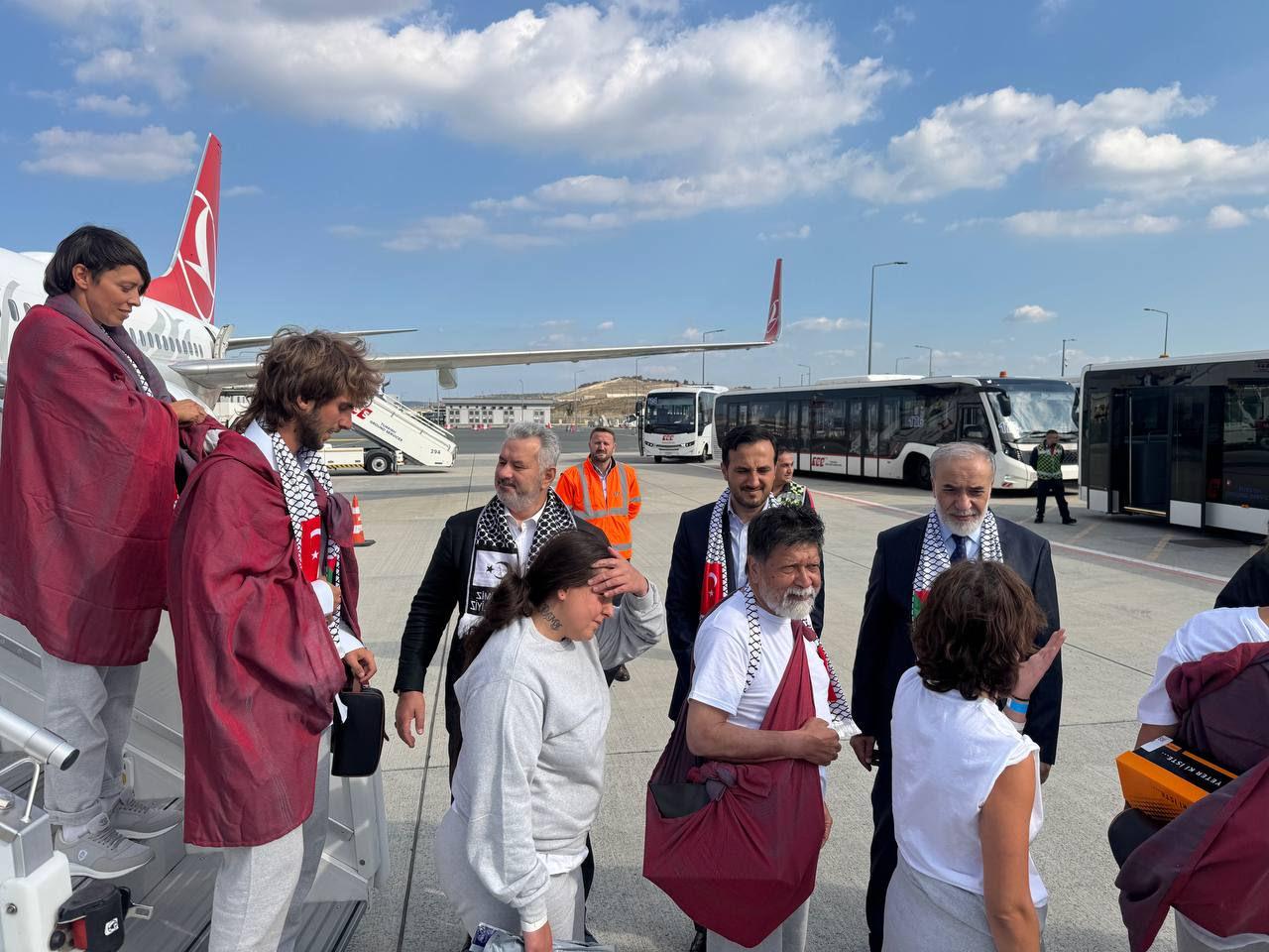 Apronda, TBMM Türkiye-Filistin Parlamentolar Arası Dostluk Grubu Başkanı ve AK Parti İstanbul Milletvekili Hasan Turan, AK Parti İstanbul İl Başkanı Abdullah Özdemir ve THY yetkilileri tarafından çiçeklerle karşılanan aktivistler, otobüsle havalimanı önüne götürüldü.