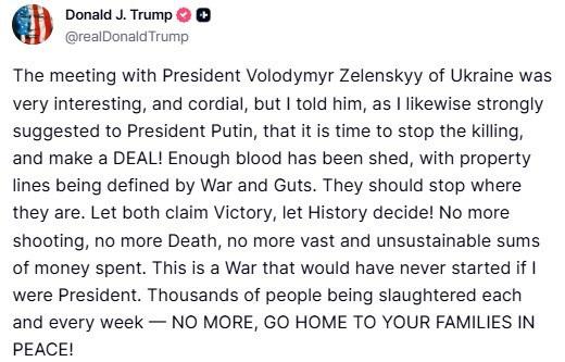 ABD Başkanı Donald Trump, kendisine ait Truth sosyal medya platformundan yaptığı açıklamada, toplantı sonrası uğurlamadığı Zelenski ile Beyaz Saray’da gerçekleştirdiği görüşmeye dair açıklamalarda bulundu.