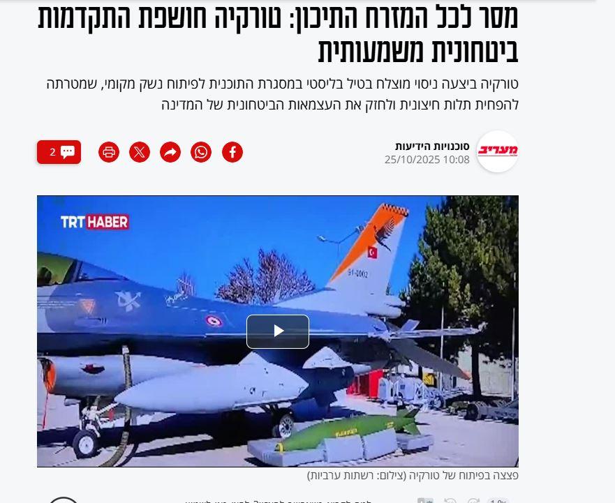 İsrail medyası ayrıca Türkiye’nin NATO'nun en büyük ikinci ordusuna sahip olduğunu vurgulayarak, “Orta Doğu'nun en gelişmiş askeri gücü olarak kabul edilen ve yüzlerce Amerikan savaş uçağına sahip İsrail'in gerisinde kalmamaya çalışıyor.” dedi.