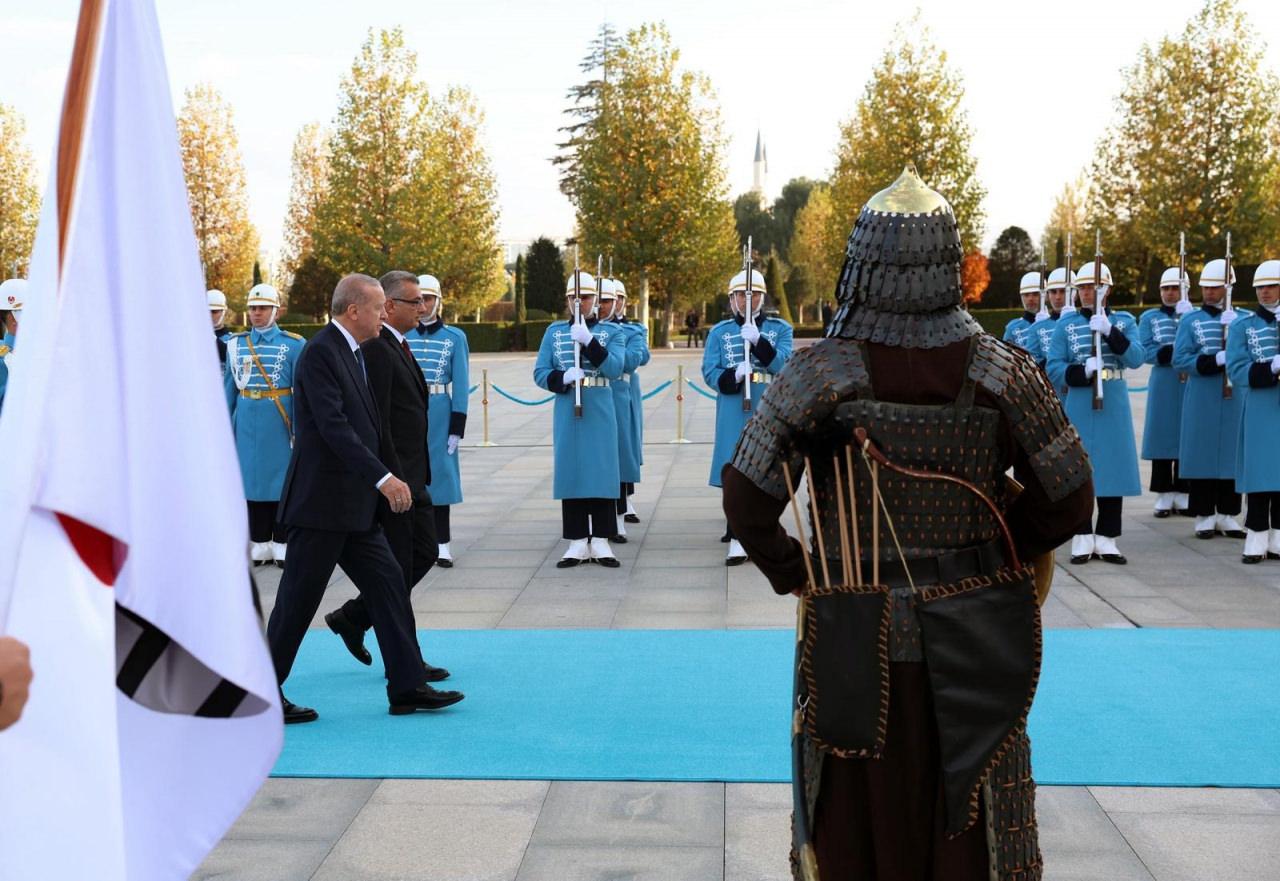 Erdoğan, Erhürman'ı Cumhurbaşkanlığı Külliyesi'nin ana giriş kapısında karşıladı. Cumhurbaşkanı Erdoğan ve Erhürman'ın tören alanındaki yerlerini almalarının ardından, 21 pare top atışı eşliğinde İstiklal Marşı çalındı.