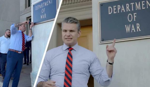 Pete Hegseth changes Department of Defense sign at Pentagon entrance to Department of War.