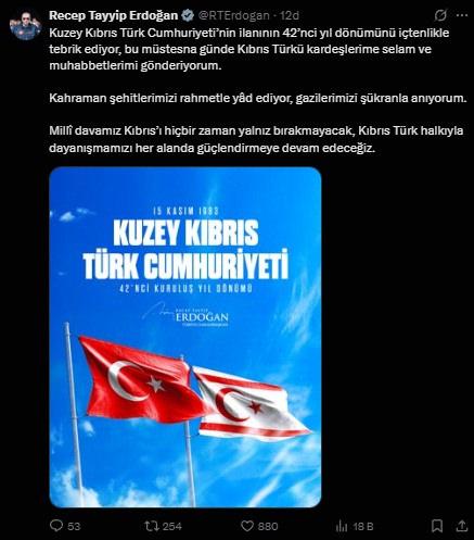 Cumhurbaşkanı Erdoğan, Kuzey Kıbrıs Türk Cumhuriyeti'nin (KKTC) 42. kuruluş yıl dönümü dolayısıyla sosyal medya hesabından paylaştığı mesajda, şunları kaydetti: