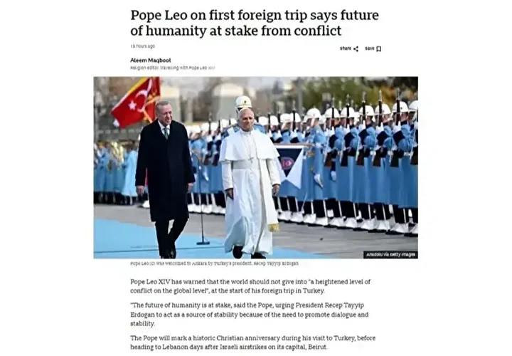 İlk yurt dışı ziyaretini Türkiye'ye yapan Papa 14. Leo'nun Ankara'da verdiği mesajlar, dünya basınında büyük yankı uyandırdı. BBC, Papa'nın Erdoğan'a istikrar kaynağı olarak rol üstlenmesi çağrısında bulunduğunu yazdı.