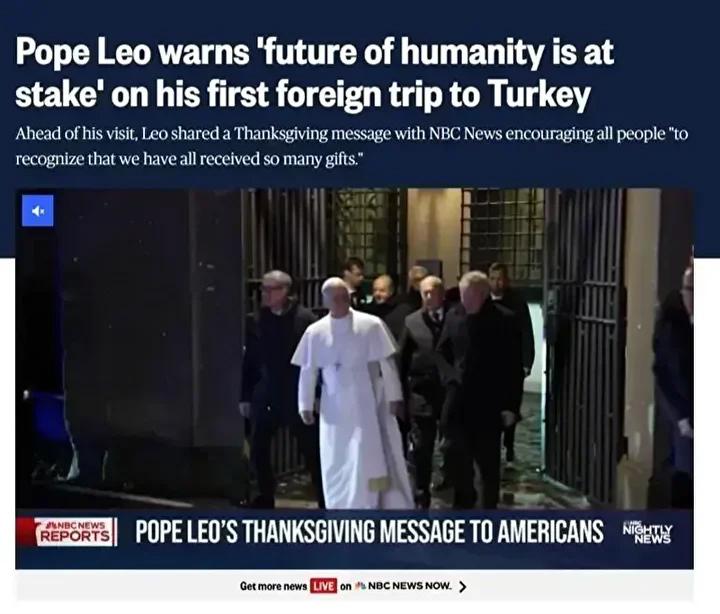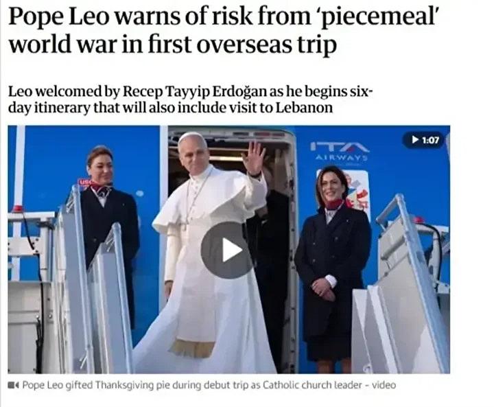 Papa 14. Leo, Türkiye ziyaretinde dünyanın 'küresel ölçekte artan bir çatışma düzeyine teslim olmaması gerektiği' uyarısında bulundu. Papa, 'İnsanlığın geleceği tehlikede' diyerek, diyalog ve istikrarın teşvik edilmesi gerektiğine dikkat çekip Cumhurbaşkanı Recep Tayyip Erdoğan'ın istikrar kaynağı olarak rol üstlenmesi çağrısında bulundu.