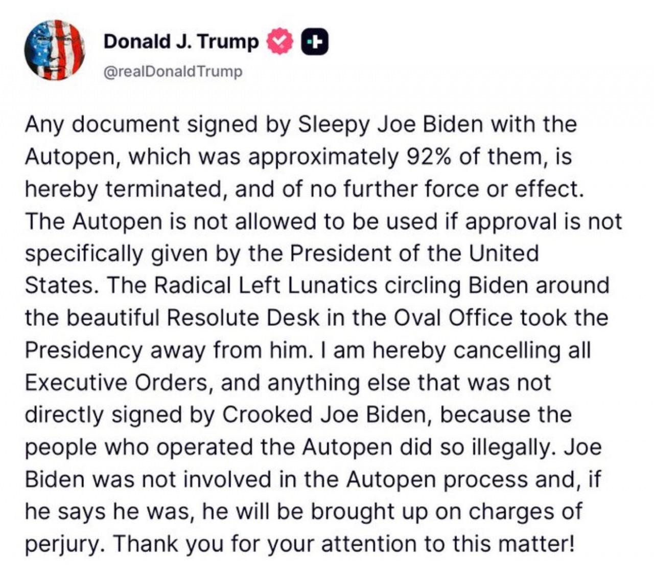 Biden tarafından bizzat imzalanmamış tüm başkanlık kararnamelerini iptal ettiğini açıklayan Trump, "Autopen'i kullanan kişiler bunu yasa dışı biçimde yaptı. Joe Biden Autopen sürecine dahil değildi ve dahil olduğunu söylerse yemin altında yalancı şahitlikten yargılanacaktır." diye konuştu.