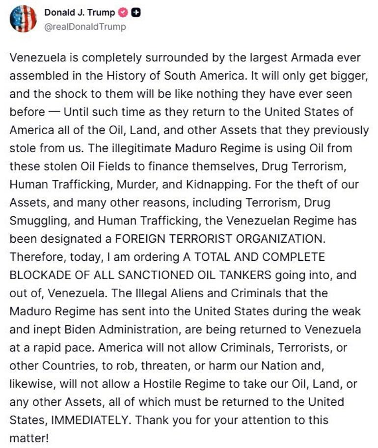 Nicolas Maduro rejiminin "gayrimeşru" olduğunu ve çalınmış petrol sahalarından elde edilen petrolü uyuşturucu terörizmi, insan kaçakçılığı, cinayet ve adam kaçırma faaliyetlerini desteklemek için kullandığını savunan Trump, "Varlıklarımızın çalınması başta olmak üzere, terörizm, uyuşturucu kaçakçılığı ve insan ticareti gibi pek çok gerekçe nedeniyle Venezuela rejimi, ‘Yabancı Terör Örgütü’ olarak tanımlanmıştır. Bu nedenle bugün, Venezuela’ya giren ve Venezuela’dan çıkan tüm yaptırıma tabi petrol tankerlerine tam ve kapsamlı bir abluka emri veriyorum." açıklamasında bulundu.
