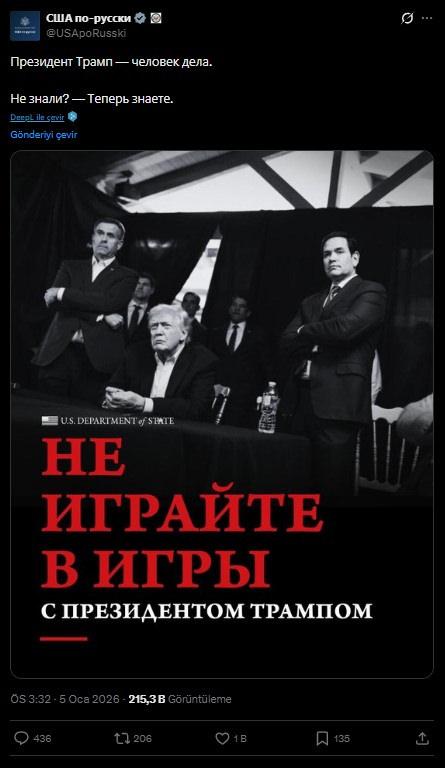 ABD Dışişleri Bakanlığı'nın Rusça X hesabı, Donald Trump ile Marco Rubio’nun, Maduro ve eşinin alıkonulduğu askeri müdahaleyi izlerken çekilmiş bir fotoğrafını yayımladığı paylaşımla "Trump ile oyun oynama" ifadesine yer verdi.