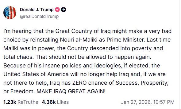ABD Başkanı Trump, Truth Social hesabından yaptığı açıklamada, Irak'ta Maliki'nin yeniden başbakan olması ihtimaline tepki gösterdi.