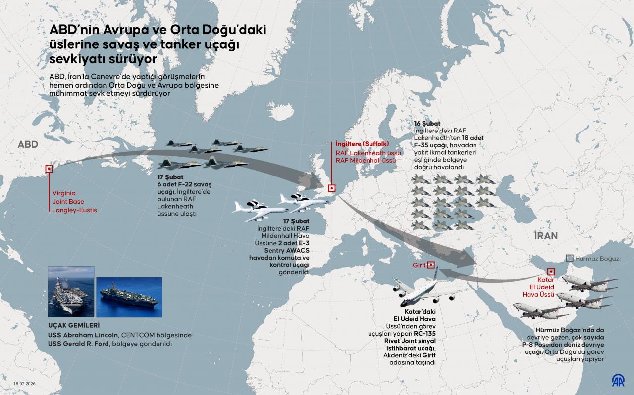 Son dakika haberi... Açık kaynak istihbaratlarını takip ve analiz eden bazı sosyal medya hesaplarındaki bilgilere göre ABD'nin son günlerde Orta Doğu bölgesine gönderdiği savaş uçağı ve diğer unsurların, 2025 Haziran'da İran'a yönelik saldırı yaptığı dönem kullandıklarıyla aynısı olduğu görüldü.