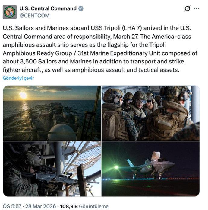 Son dakika.... ABD Merkez Komutanlığı (CENTCOM), sosyal medya hesabından yaptığı açıklamada, ABD Donanması’na bağlı denizciler ve Deniz Piyadeleri’nin 27 Mart’ta USS Tripoli (LHA-7) ile sorumluluk alanına ulaştığını duyurdu.