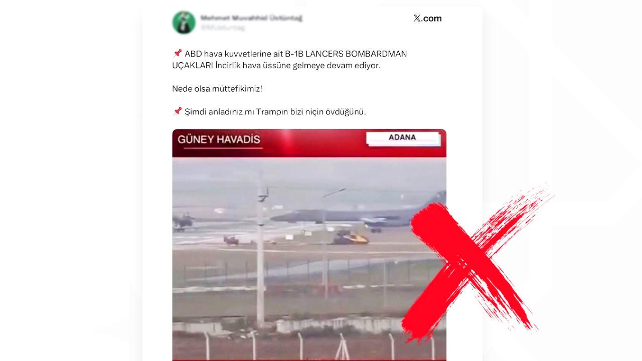 Cumhurbaşkanlığı İletişim Başkanlığı Dezenformasyonla Mücadele Merkezi (DMM), sosyal medyada yer alan ABD'ye ait B-1B Lancer bombardıman uçaklarının İncirlik Hava Üssü'nde iniş ve kalkış yaptığına dair iddiaların gerçeği yansıtmadığını bildirdi.