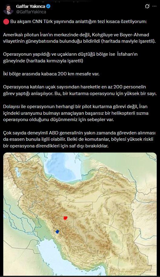 Gaffar Yakınca sosyal medya hesabından yaptığı paylaşımda ABD’ye ait düşürülen F-35E uçağının İran’ın merkezinde değil, Kohgiluye ve Boyer-Ahmad vilayetinin güneybatısında bulunduğunu, operasyonun yapıldığı ve uçağın düştüğü yerin ise İsfahan’ın güneyi olduğunu belirtti.