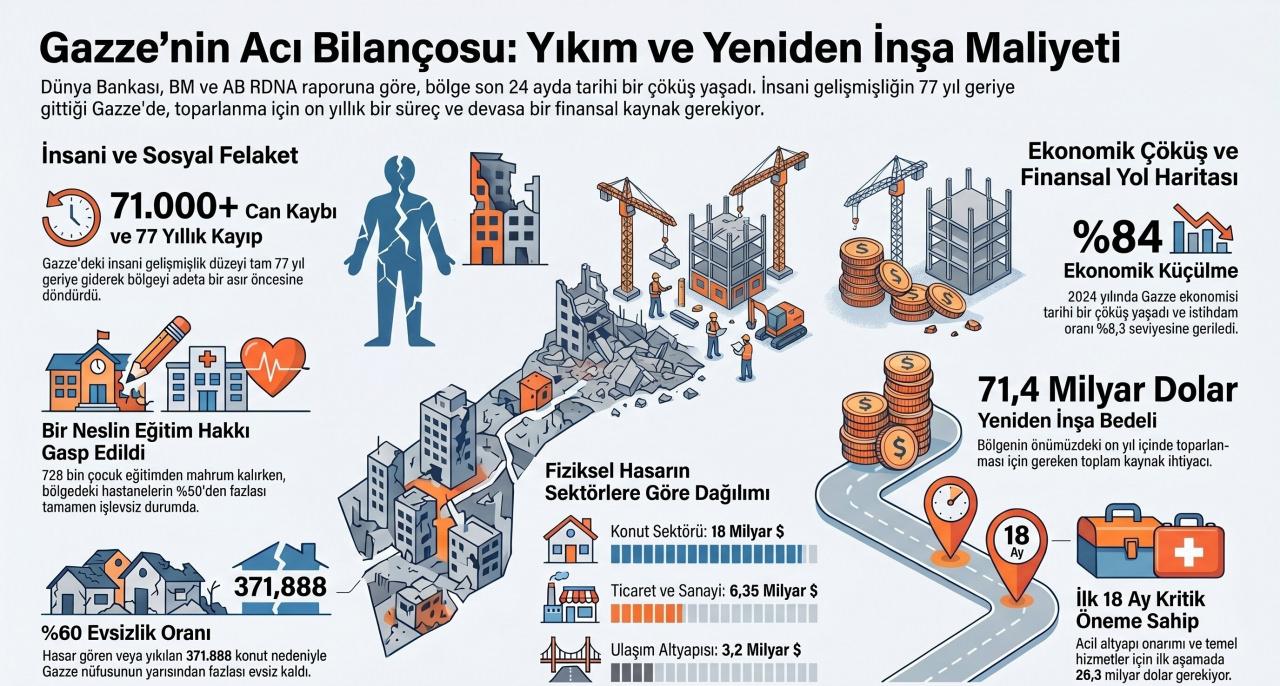 Dünya Bankası, Avrupa Birliği ve Birleşmiş Milletler tarafından hazırlanan son rapor, Gazze'deki 24 aylık yıkımın acı tablosunu gözler önüne serdi. Bölgenin yeniden ayağa kalkması için 71,4 milyar dolara ihtiyaç duyulurken, insani gelişmişliğin tam 77 yıl geriye gittiği vurgulandı. Gazze Şeridi'nde Ekim 2023 ile Ekim 2025 tarihleri arasında yaşanan 24 aylık soykırım sürecinin ardından hazırlanan Nihai Gazze Hızlı Hasar ve İhtiyaç Analizi (RDNA) raporu yayımlandı. Dünya Bankası, Birleşmiş Milletler (BM) ve Avrupa Birliği (AB) tarafından ortaklaşa hazırlanan rapor, bölgedeki fiziksel, sosyal ve ekonomik yıkımın boyutlarını tüm çıplaklığıyla ortaya koydu. Rapora göre, Gazze'nin önümüzdeki on yıl içinde yeniden inşası ve toparlanması için toplamda 71,4 milyar dolarlık devasa bir kaynağa ihtiyaç duyuluyor.