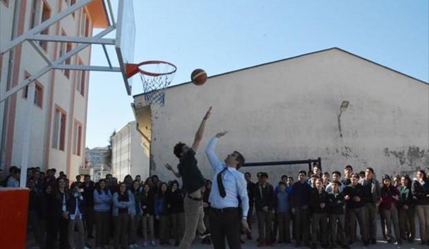 Yemenici, daha sonra okul bahçesinde basketbol oynayan çocuklarla maç yaptı.