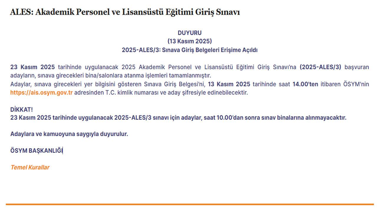 23 Kasım 2025 tarihinde uygulanacak 2025-ALES/3 sınavı için adaylar, saat 10.00’dan sonra sınav binalarına alınmayacaktır. Adaylara ve kamuoyuna saygıyla duyurulur.'' şeklinde ifadelere yer verdi.