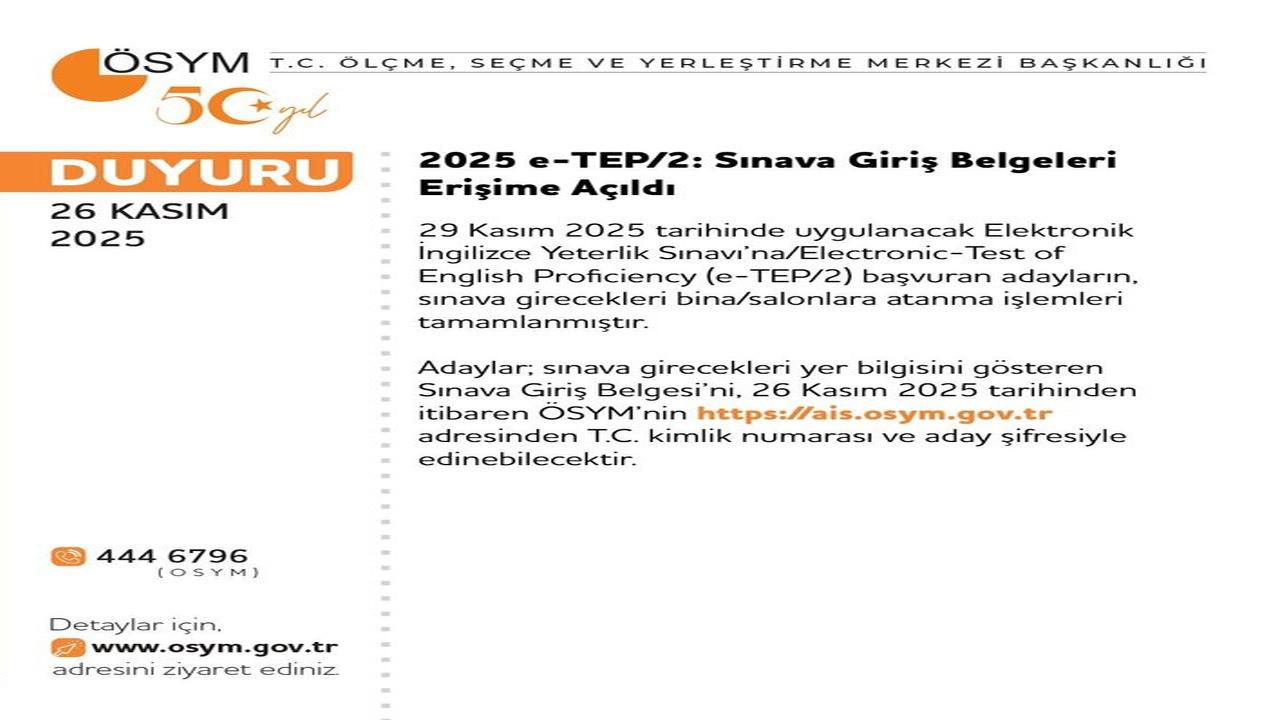 ÖSYM (Ölçme Seçme ve Yerleştirme Merkezi) tarafından 2025 e-Tep/2 sınava giriş belgelerinin erişime açıldığı bilgisi adaylara paylaşıldı.