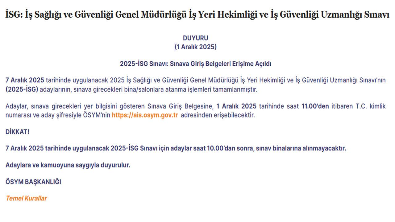 7 Aralık 2025 tarihinde uygulanacak 2025-İSG Sınavı için adaylar saat 10.00’dan sonra, sınav binalarına alınmayacaktır. Adaylara ve kamuoyuna saygıyla duyurulur.