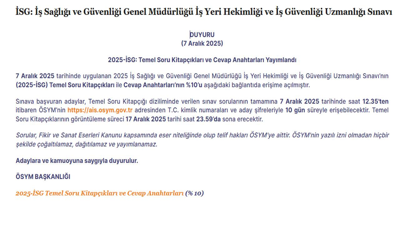 ÖSYM tarafından, ''7 Aralık 2025 tarihinde uygulanan 2025 İş Sağlığı ve Güvenliği Genel Müdürlüğü İş Yeri Hekimliği ve İş Güvenliği Uzmanlığı Sınavı’nın (2025-İSG) Temel Soru Kitapçıkları ile Cevap Anahtarları’nın %10’u aşağıdaki bağlantıda erişime açılmıştır.
