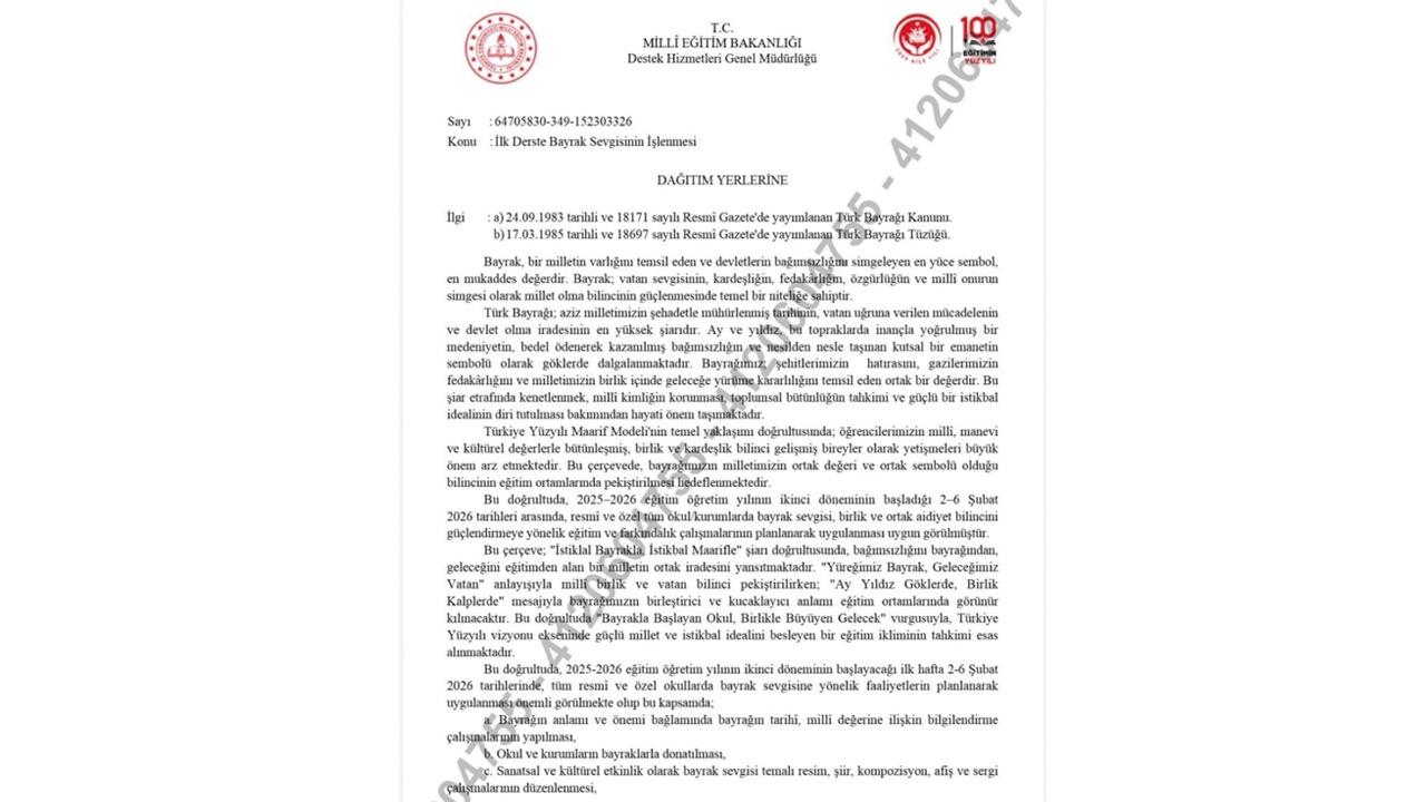 Bakanlık tarafından iletilen talimatta, 2-6 Şubat 2026 tarihleri arasında, ikinci dönemin başlangıç haftasında, resmî ve özel tüm okul ve kurumlarda bayrak sevgisi, birlik ve ortak aidiyet bilincini artırmaya yönelik eğitim ve farkındalık çalışmalarının planlanarak uygulanmasının uygun görüldüğü belirtildi.