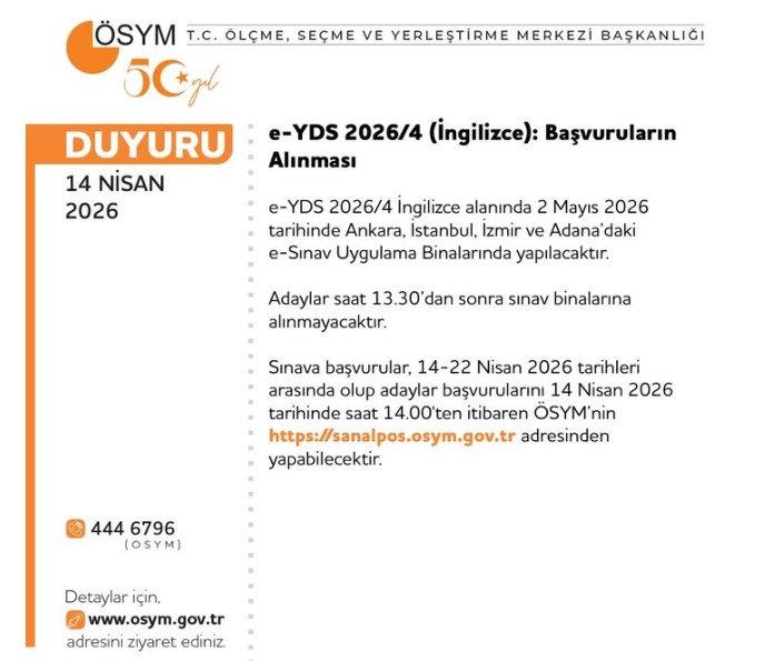 ÖSYM yabancı dil puanı hedefleyen adayların merakla beklediği e-YDS 2026/4 (İngilizce) sınav duyurusunu yayımladı. Başvuru ekranı 22 Nisan tarihine kadar açık kalacak.