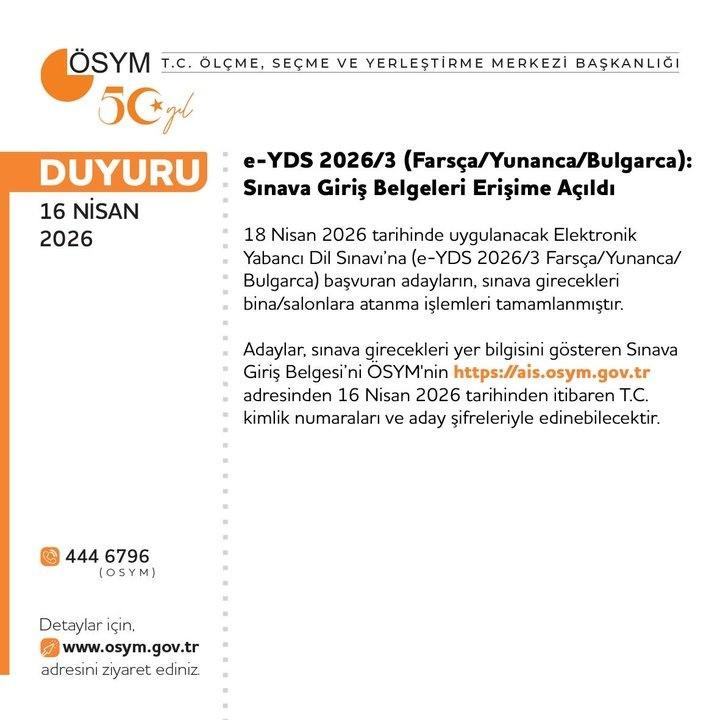 ÖSYM, 18 Nisan 2026 tarihinde gerçekleştirilecek e-YDS 2026/3 (Farsça/Yunanca/Bulgarca) sınavına ilişkin önemli bir duyuru yayımladı.