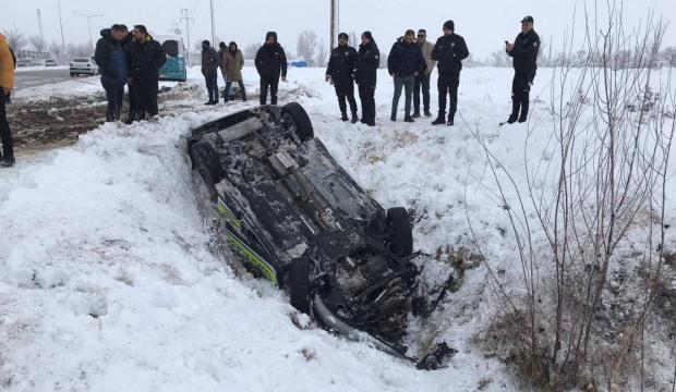 Karayolunda seyir halinde olan polis aracı, kardan dolayı kontrolden çıkıp şarampole yuvarlandı.