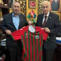 Devlet Bahçeli'yi makamında ziyaret eden Diyarbakırspor Kulüp Başkanı Bedirhan Akyol, Bahçeli'ye Diyarbakırspor forması hediye etti.