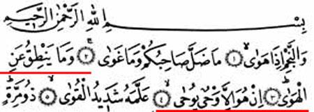 (3)O, nefis arzusu ile konuşmaz. (4)(Size okuduğu) Kur'an ancak kendisine bildirilen bir vahiydir.
