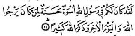 Andolsun, Allahın Resülünde sizin için; Allaha ve ahiret gününe kavuşmayı uman, Allahı çok zikreden kimseler için güzel bir örnek vardır.