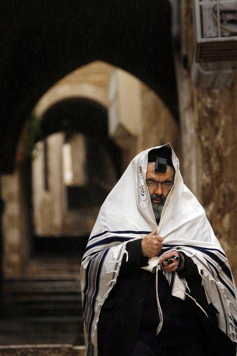 19 Şubat 2008 tarihinde Kudüs'ün eski şehir alanındaki Yahudi Mahallesi çekilmiş fotoğrafta ise ibadet için namaz şalına sarılmış ultra-Ortodoks bir Yahudi adam görünüyor...