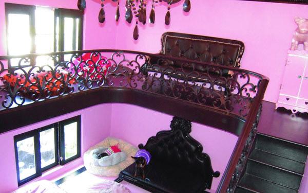 Hilton'ın kendi evinin tasarımından esinlenilerek hazırlanan köpek sığınağının içi pespembe... Ayrıca içerde siyah avizeler ve hatta küçük koltuklar bulunuyor.