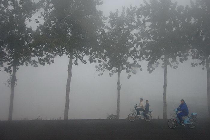 Çin'de, yoğun sis bisikletle gezintiye engel değil...