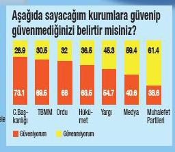 Cumhurbaşkanlığı yüzde 73.1 ile en güvenilen kurum olurken, Orduya güvenenlerin oranı yüzde 68, hükümete güven duyanların oranı yüzde 63.5 oldu. Medya ve muhalefet partileri ise güvenilen kurumlar arasında son iki sırada yer aldı. Başbakan Recep Tayyip Erdoğan'a güvendiğini söyleyenlerin oranı yüzde 61'i, Erdoğan'ın İsrail ile restleşmesini doğru bulanların oranı yüzde 66.9'u buldu.