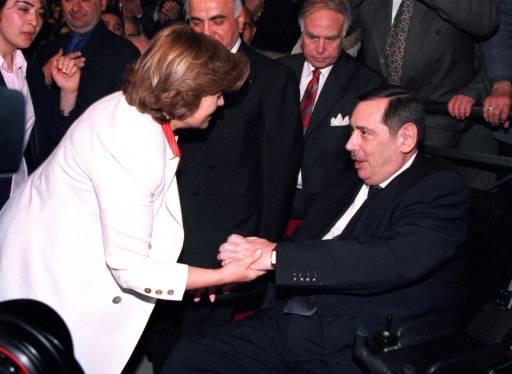 2001 - ANKARA ATATÜRK SPOR SALONUN'DA YAPILAN DYP''NİN GENİŞLETİLMİŞ TEMSİLCİLER MECLİSİ TOPLANTISINDA DYP GENEL BASKANI TANSU ÇİLLER PARTİYE YENİ KATILAN BAĞIMSIZ MİLLETVEKİLİ AYDIN MENDERES'İ KUTLADI....