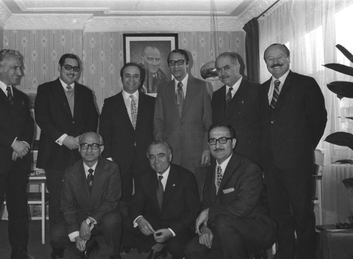 1 OCAK 1971 - AP'DEN AYRILAN PARLAMENTERLERİN KURDUĞU DEMOKRATIK PARTI (DP) YONETİCİLERİ GENEL MERKEZDE. TALAT ASAL (SOLDA, AYDIN MENDERES (SOL 2), GENEL BAŞKAN FERRUH BOZBEYLİ (SAG 3), GENEL BAŞKAN YARDIMCILARI FARUK SÜKAN (SAĞDA), SADETTİN BİLGİÇ (SAĞ 2.), OTURANLAR (SOLDAN SAĞA), NURİ EROĞAN, MEHMET TURGUT VE CEVAT ÖNDER.)