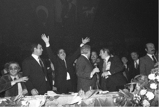 21 KASIM 1978 - ADALET PARTİSİ 9. BÜYÜK KONGRESİNE KATILAN AYDIN MENDERES (KOLLARI AÇIK) DELEGELERİ SELAMLADI...