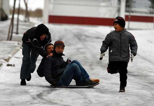 Karın keyfini çıkaran minikler, kaymak için en küçük tepeleri bile değerlendirir.
