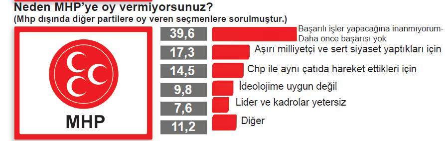 İktidara karşı denge olsun diye MHPye oy veren/verecek seçmen ise yüzde 18,3 oranında. Bu öncelik CHPde 5,1 iken MHPde bu denli yüksek çıkması milliyetçi seçmenin AK Parti rahatsızlığını gözler önüne seriyor. Yüzde 4,6lık kesimin alternatifi yok diye MHPyi seçmesi de, söylemleri daha keskin bir milliyetçi kesimin var olduğu şeklinde yorumlanabilir.