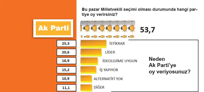Bu pazar seçim olsa oyunu Ak Partiye vereceğini belirten yüzde 53,7lik seçmenin tercih gerekçelerinin başında İstikrar geliyor. Daha çok ekonomi çevrelerinin dillendirdiği bu söylemin AK Parti seçmeninin yarıya yakın oranına tekabül etmesi dikkat çeken bir ayrıntı.