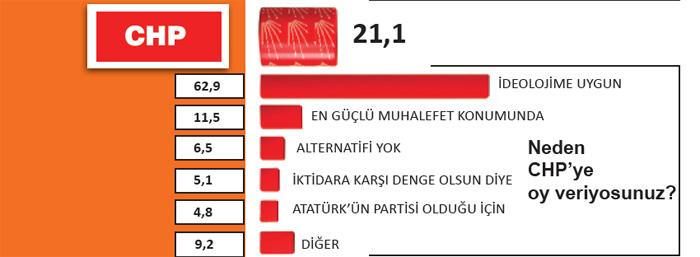 Bu Pazar seçim olsa oyunu CHPye vereceğini belirten yüzde 21,1lik seçmenin tercih gerekçelerinin başında yüzde 62,2yle ideoloji geliyor. Bu sonuç sol ve sosyal demokrat seçmenin, CHPyle kopmaz bir şekilde bütünleştiği anlamına geliyor.